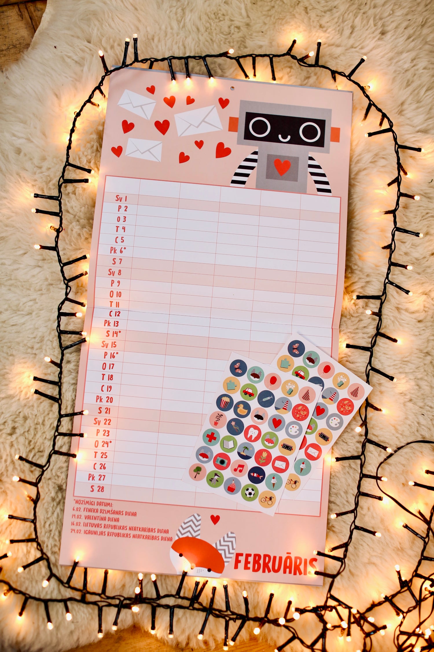 Krāsains sienas kalendārs, kas palīdzēs plānot aktivitātes katram ģimenes loceklim un visai ģimenei kopā. Lapsa kalendārā atzīmējusi svinamos un svarīgos datumus, bet Āpsītis pievienojis skaistas uzlīmes, kas ļaus vienkārši un jautri organizēt mēneša plānus arī pašiem mazākajiem.